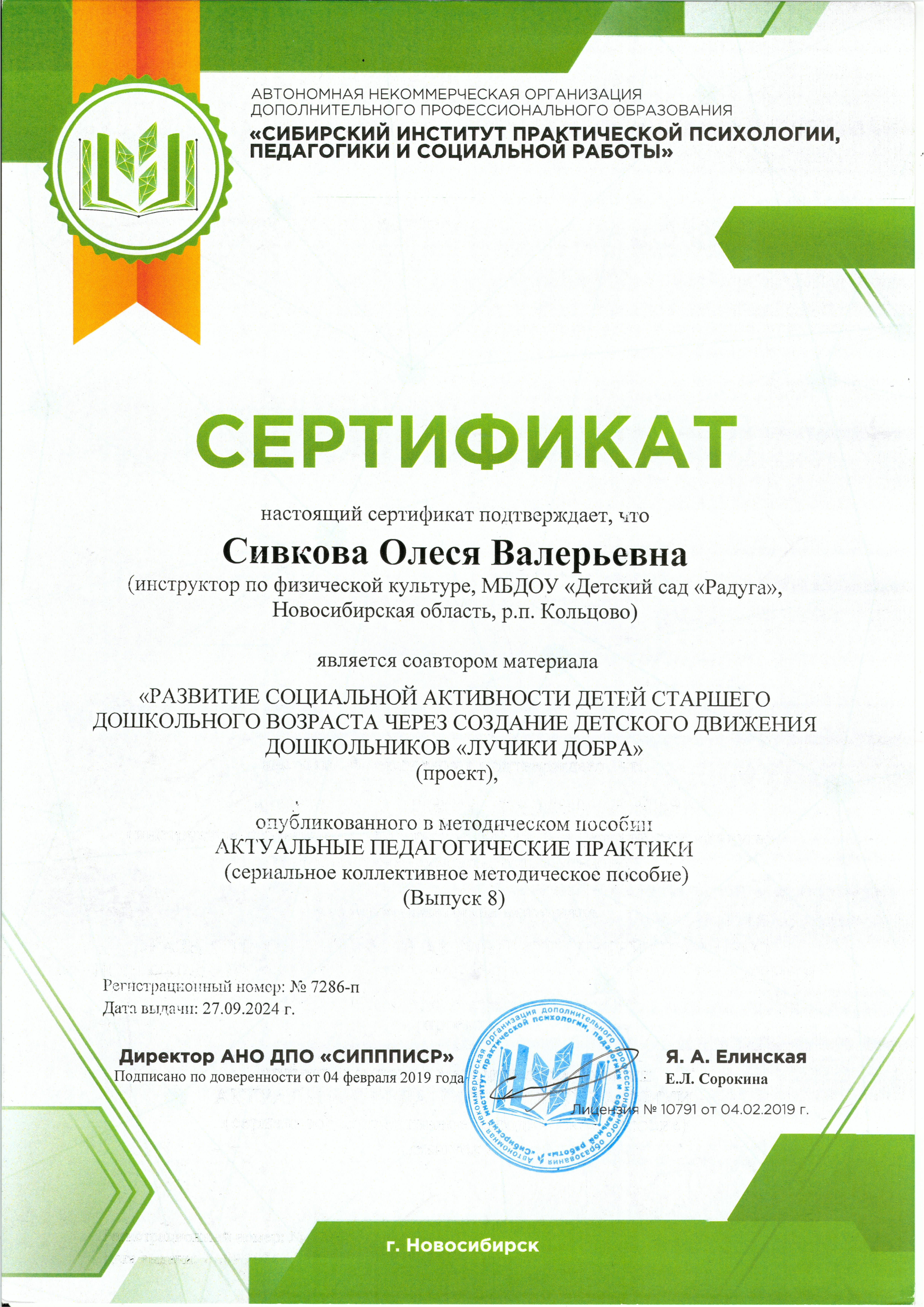 Сертификат соавтора материала "Развитие социальной активности детей старшего дошкольного возраста через создание детского движения дошкольников "Лучики добра", 2024 год